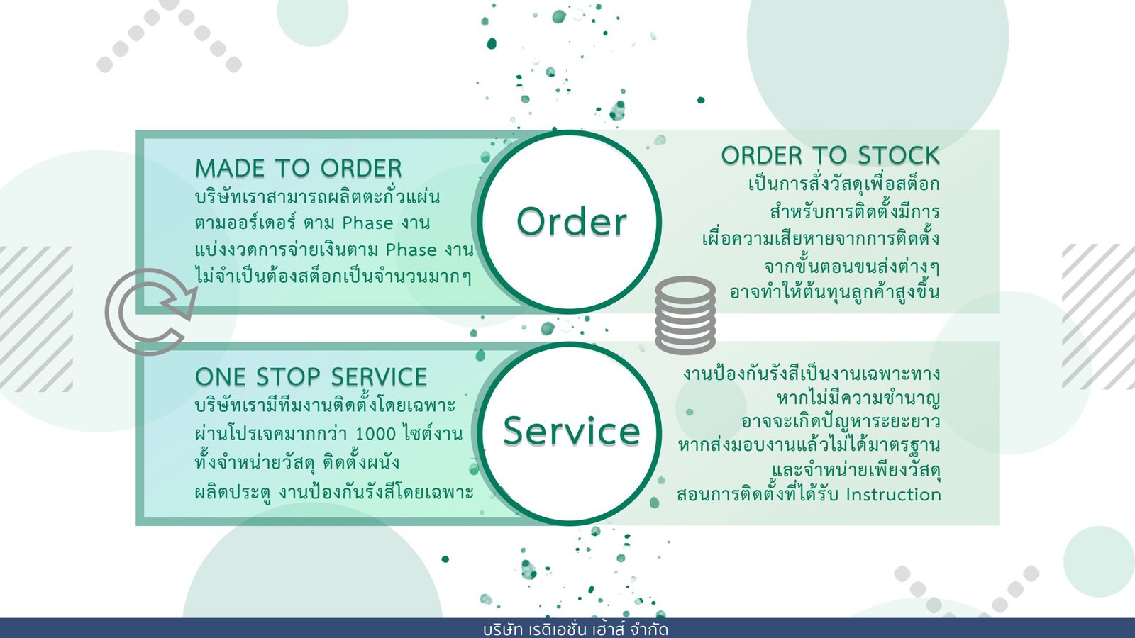 2. การบริการแบบ One Stop Service ครบจบที่เรา จากประสบการณ์การทำงานที่มีมากกว่า 50 ปี ในการทำธุรกิจ ทำให้เรามีความมั่นใจอย่างยิ่งว่าเรามอบสิ่งที่ดีที่สุดให้ลูกค้า เรามีบริการทั้งด้านการให้คำปรึกษาแนะนำ การผลิตและจัดจำหน่าย การติดตั้งจากทีมงานผู้เชี่ยวชาญระดับประเทศ ทำให้เรามีผลงานอย่างต่อเนื่องและได้รับความเชื่อมั่นจากลูกค้าตลอดมา